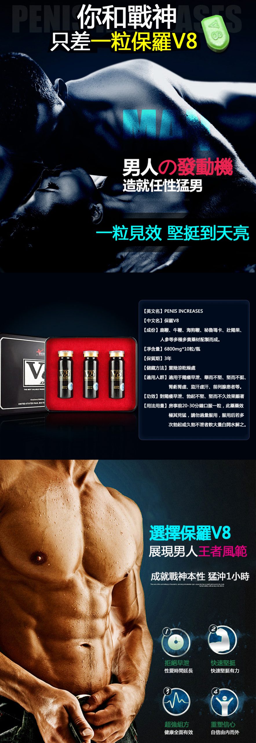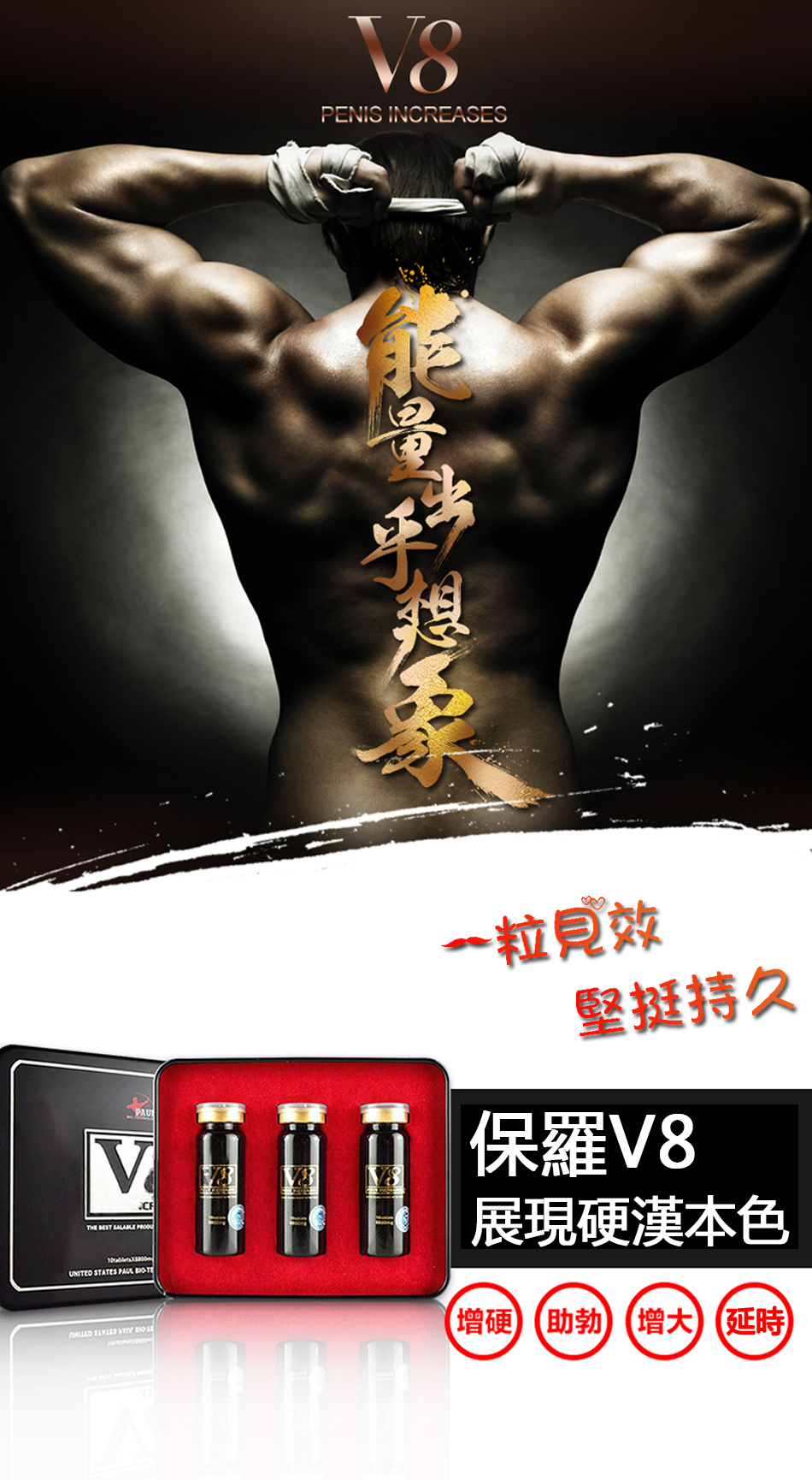 保羅V8使人體吸收快,能迅速恢復體力,能有效解抉性愛短暫,防止早泄,延長性愛時間,而且能在人體內留存180小時,不會產生任何的副作用,及依賴性,沒有臉紅,心跳加速,惡心頭痛等反應,而且不受心臟病,高血壓,糖尿病的影響,對前列腺患者有顯著的療效.酒後服用不影響效果,再次成為繼偉哥之後最暢銷的男性保健品。